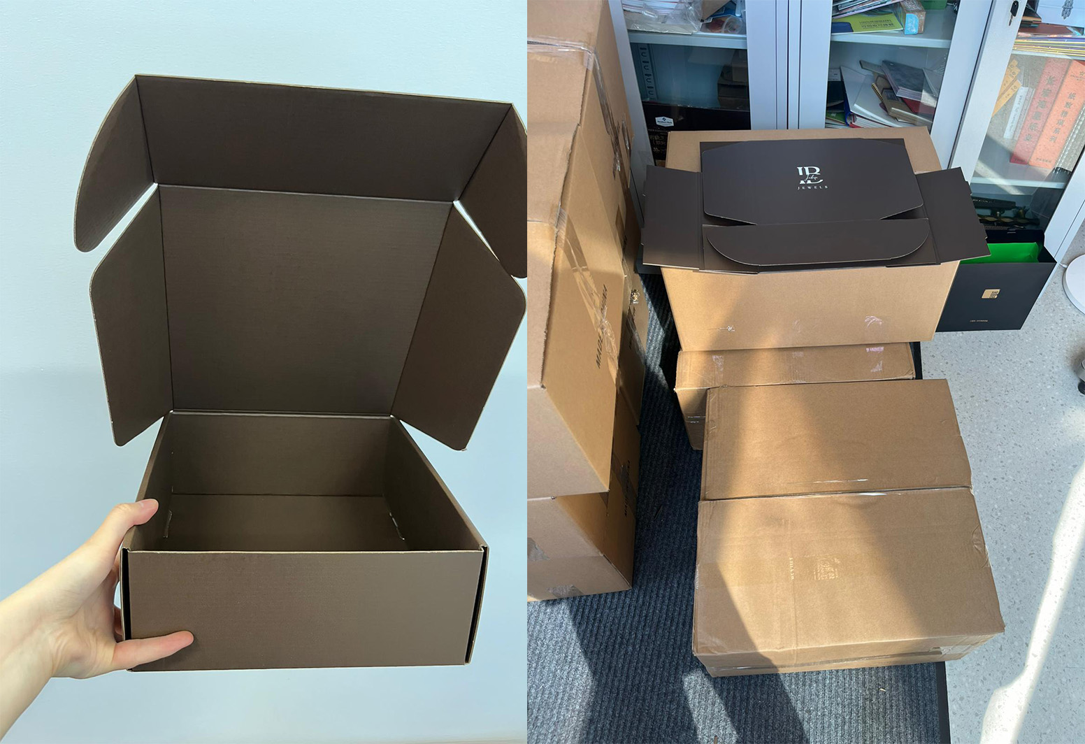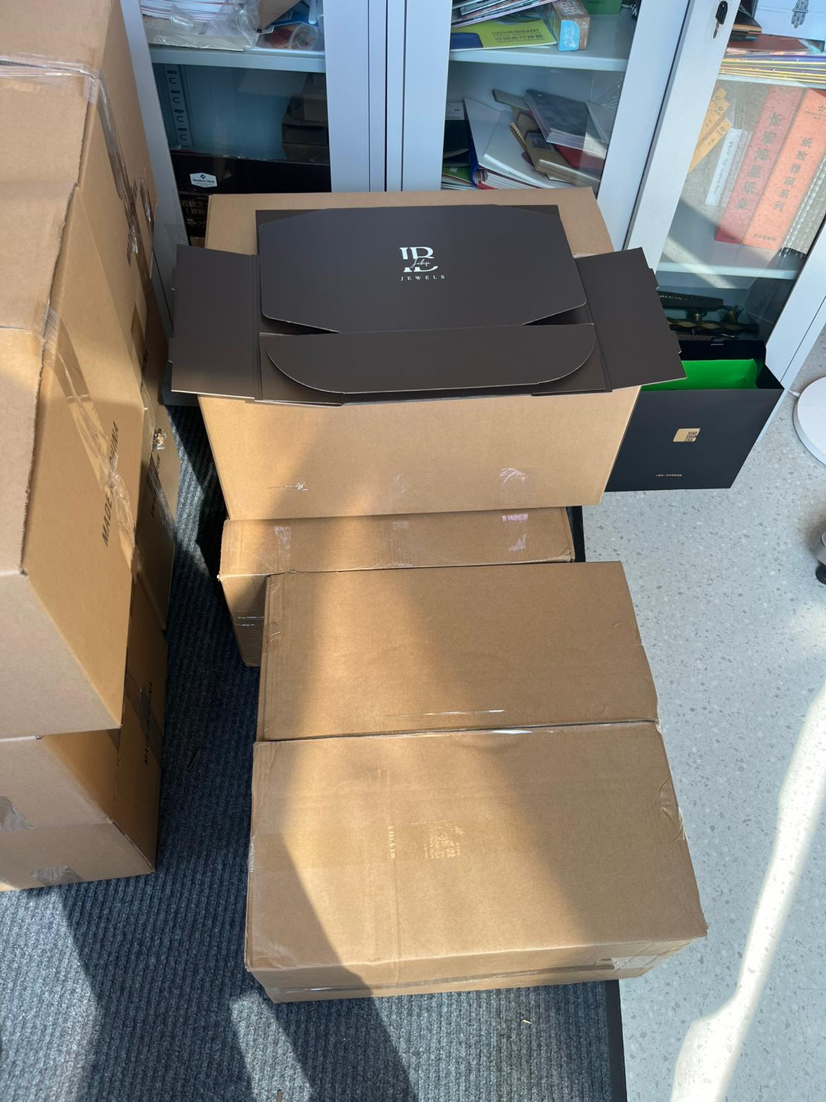The boxes arrived in perfect condition, featuring her brand’s elegant logo printed in white on rich brown rigid boxes — a perfect match for her jewelry aesthetic.