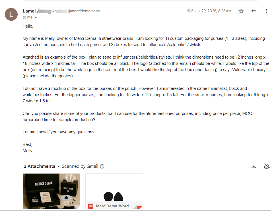“You beat out the competition. The look and feel are exactly what I wanted. Every detail — from the influencer box to the dust bag — tells the story of Merci Dema. You didn’t just make packaging; you helped me create an experience.”