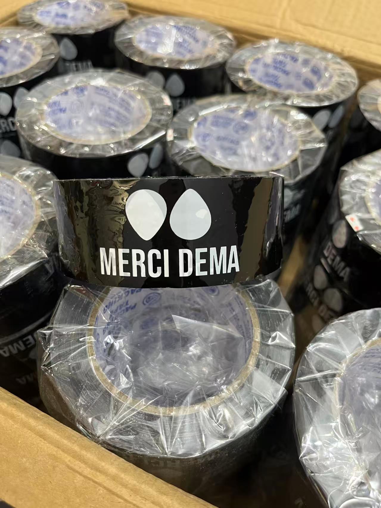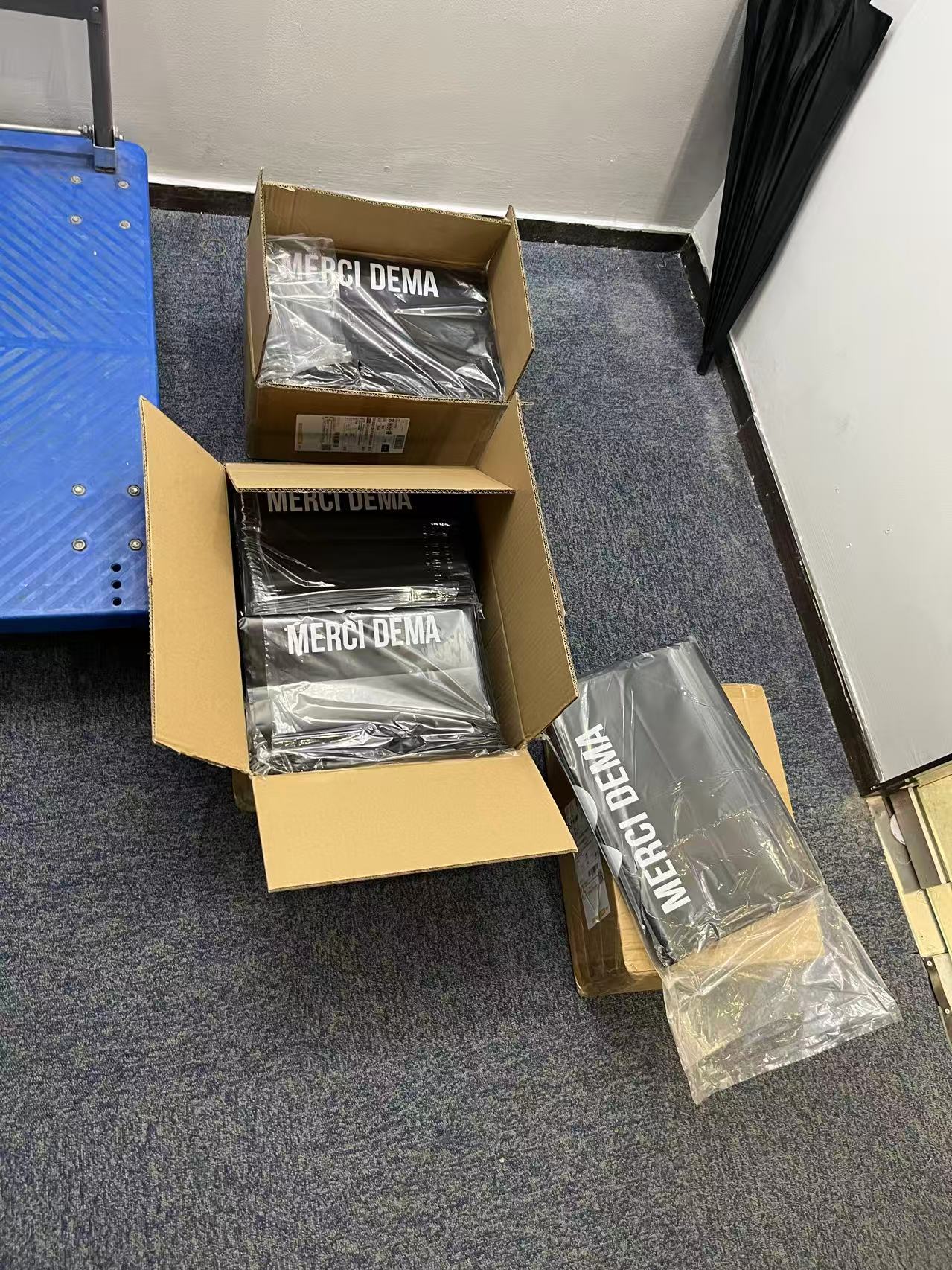 Over time, our collaboration grew from testing purse boxes to producing influencer boxes, dust bags, and later, fully branded polymailers and tapes — all featuring Merci Dema’s signature white tears logo and powerful phrases.