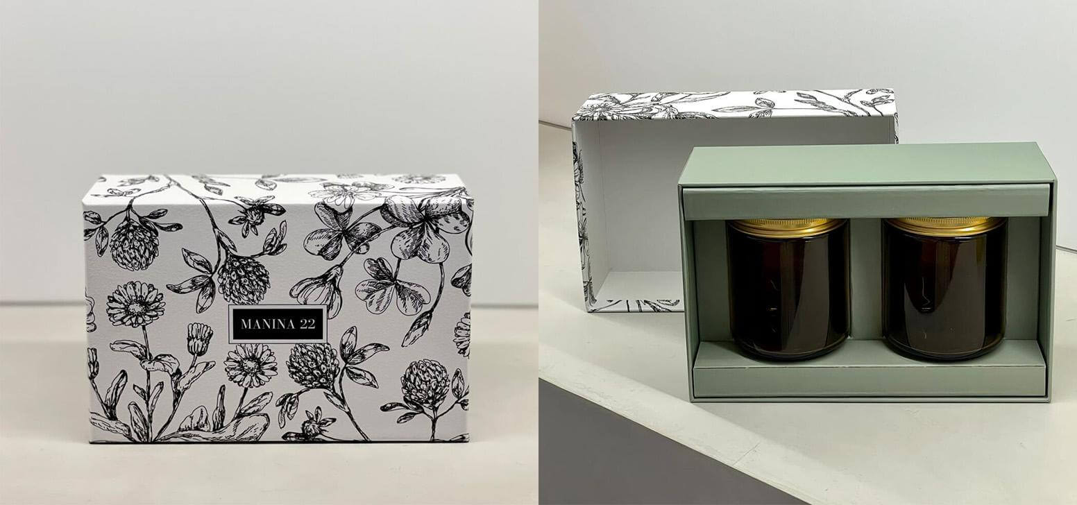 This rigid gift box features elegant black botanical illustrations on a clean white exterior, creating a timeless and artistic look. Inside, a structured insert securely holds multiple products while enhancing presentation. The contrast between the decorative outer box and the solid inner tray delivers a refined unboxing experience, ideal for candles, gourmet items, or curated gift sets.