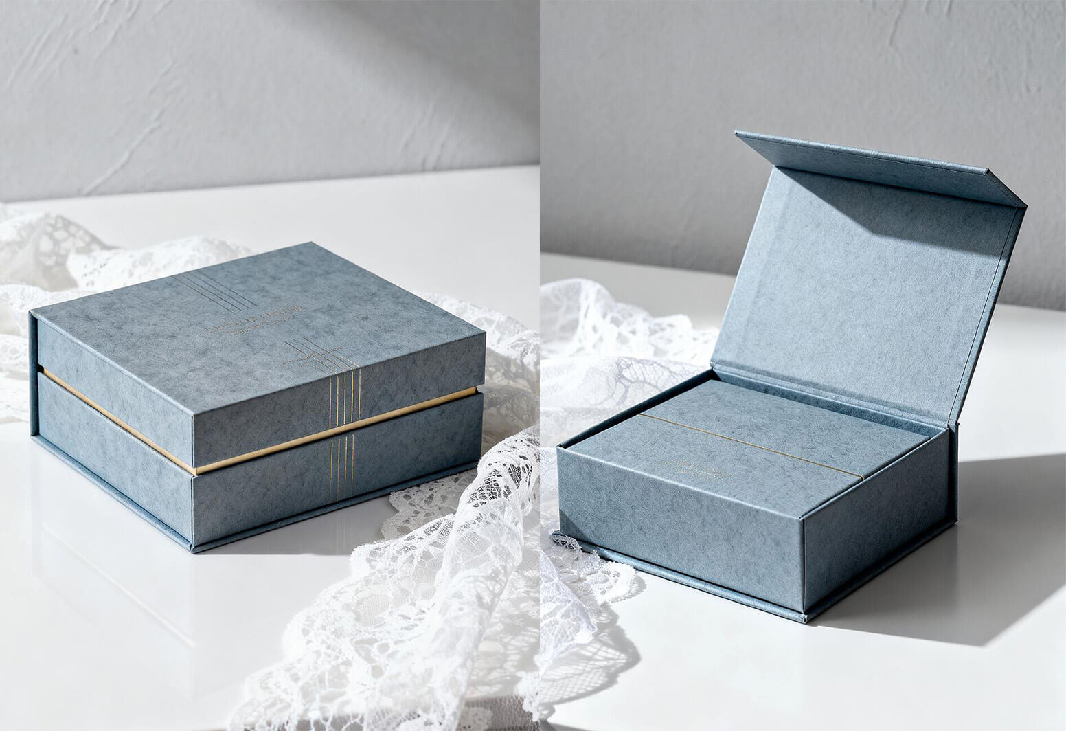 Crafted with a soft-touch textured paper in a muted blue tone, this flip-top rigid box exudes understated luxury. Delicate gold line accents add a refined detail, while the hinged lid creates a smooth, ceremonial unboxing experience. Ideal for jewelry, accessories, or premium gift sets that require both protection and presentation.