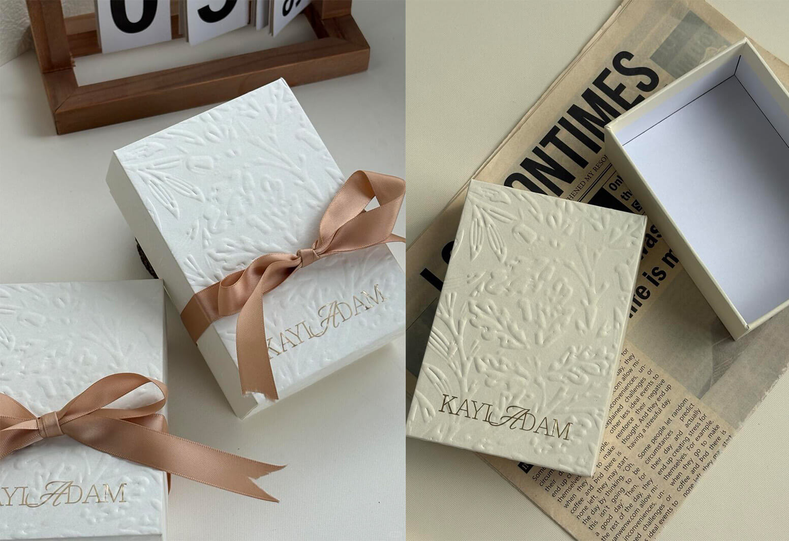 This elegant rigid gift box features a delicate embossed floral pattern that adds texture and visual depth. Finished with soft gold foil branding and a satin ribbon closure, it creates a graceful and memorable unboxing experience. Ideal for jewelry, bridal gifts, cosmetics, or special occasion packaging where elegance and detail matter.