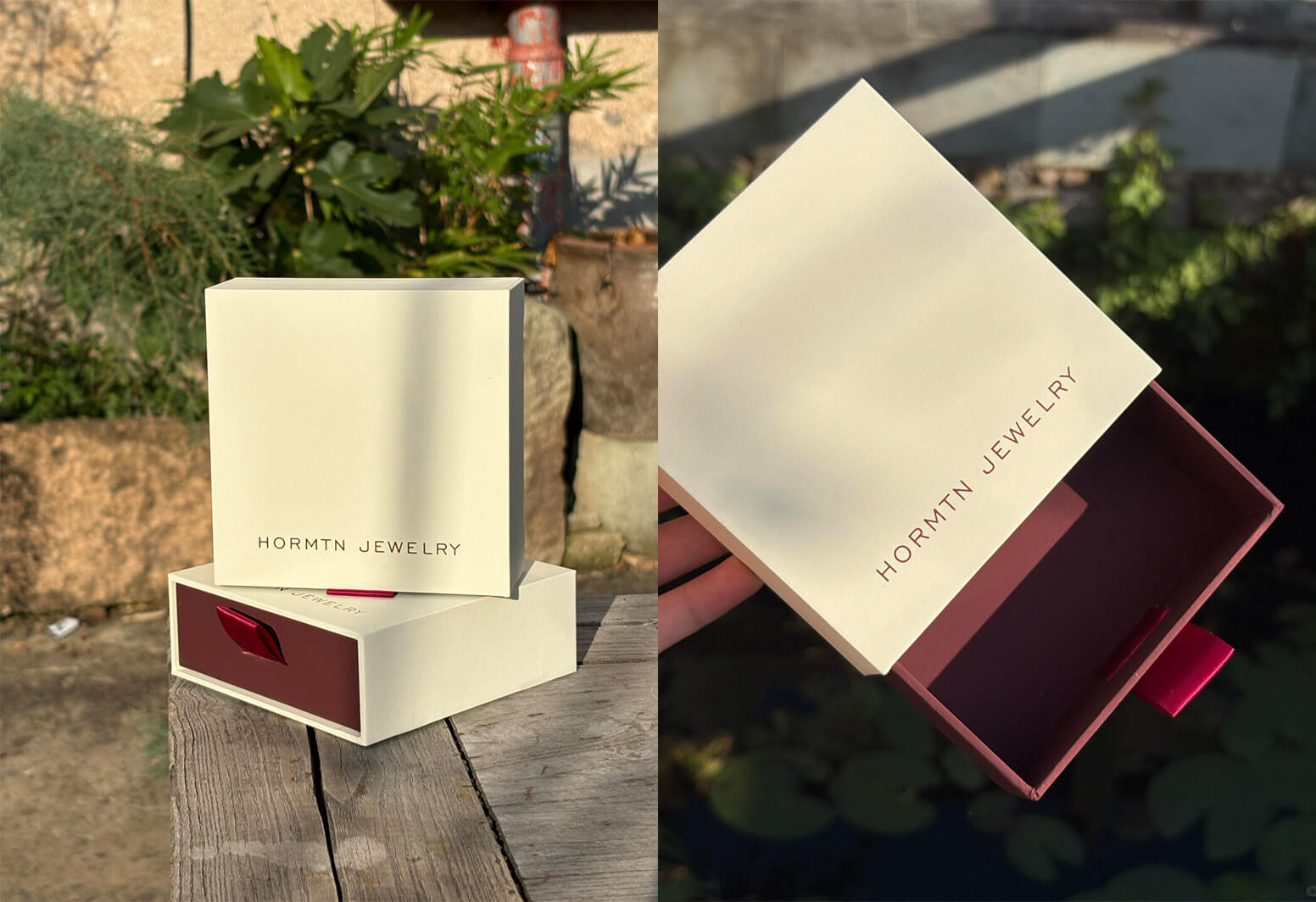 This premium drawer-style rigid box features a soft ivory exterior paired with a deep burgundy inner tray for a refined contrast. Clean typography keeps the branding understated, while the pull-out structure adds a smooth, elevated unboxing experience. Ideal for jewelry brands seeking timeless, elegant packaging that highlights craftsmanship and brand value.