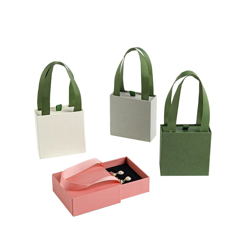 This adorable design takes inspiration from a mini handbag, transforming packaging into a fashion accessory. Structured and portable, the box features wide ribbon handles and a smooth drawer compartment. The contrast between soft box colors and deep green straps adds a fresh, lifestyle-driven feel. Perfect for gifting seasons or boutique brands wanting a playful yet premium look.