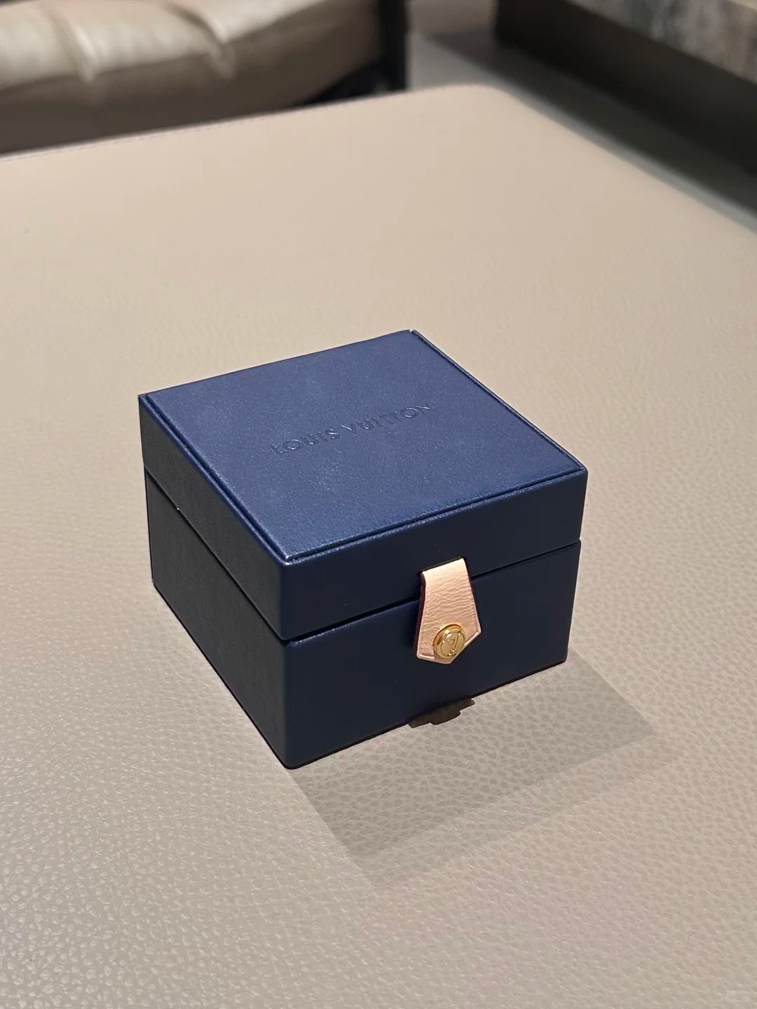 A compact, structured box with a magnetic snap closure and gold hardware detail, combining elegance with practicality. The deep navy color evokes sophistication, while the subtle logo keeps the design clean. Perfect for premium rings or small keepsakes.