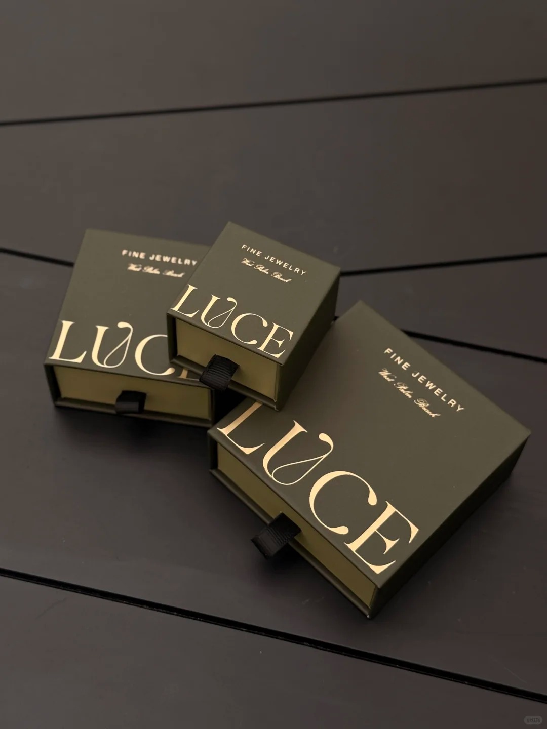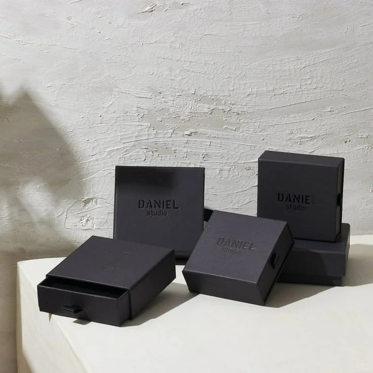 A monochrome collection of matte black drawer boxes with subtle debossed logos offers a sleek, modern luxury experience. The uniform tone gives the packaging a minimalist yet high-end appeal. Ideal for rings, earrings, and pendants, this style suits brands that focus on bold simplicity and strong visual identity.