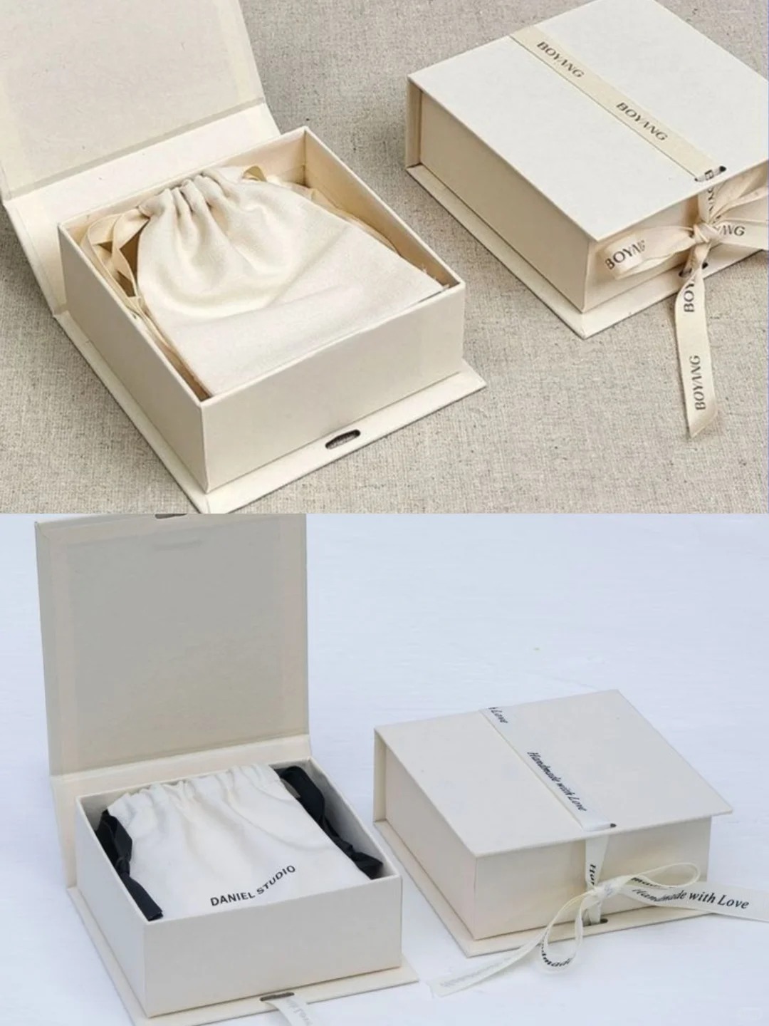 This design combines a rigid box with a drawstring cotton pouch inside, adding both structure and softness. The exterior is wrapped with custom-printed ribbon, enhancing the ceremonial feel of unboxing. It’s a lovely choice for handmade jewelry, artisan brands, or giftable pieces that require warmth and personality.