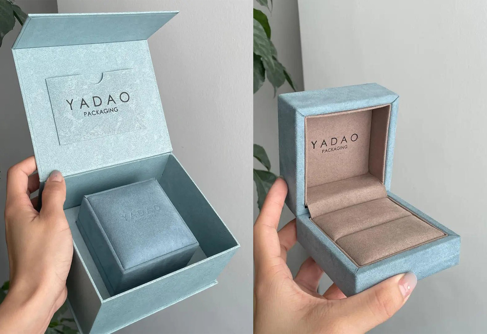 This premium packaging uses soft-touch material inside and out, creating a velvety, cushion-like feeling. The structured lid and suede interior make it ideal for rings or high-value items. Its muted, elegant color palette adds to the refined sense of exclusivity.