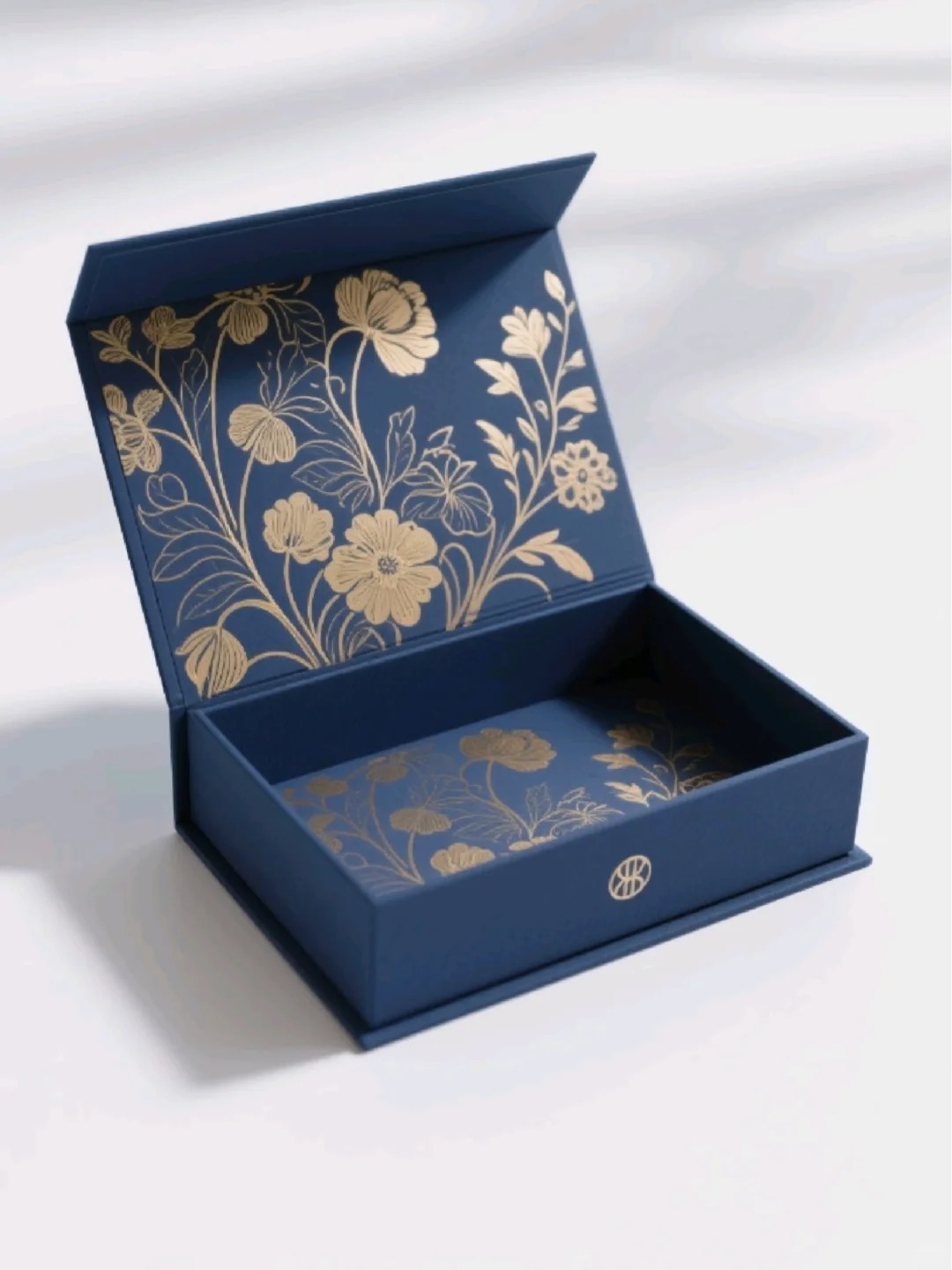 This artistic box features intricate gold-foil floral patterns on a deep navy background. The interior continues the same botanical motif, creating a cohesive, luxurious storytelling moment. This style suits elegant collections, wedding gifts, or brands seeking to incorporate nature-inspired luxury.