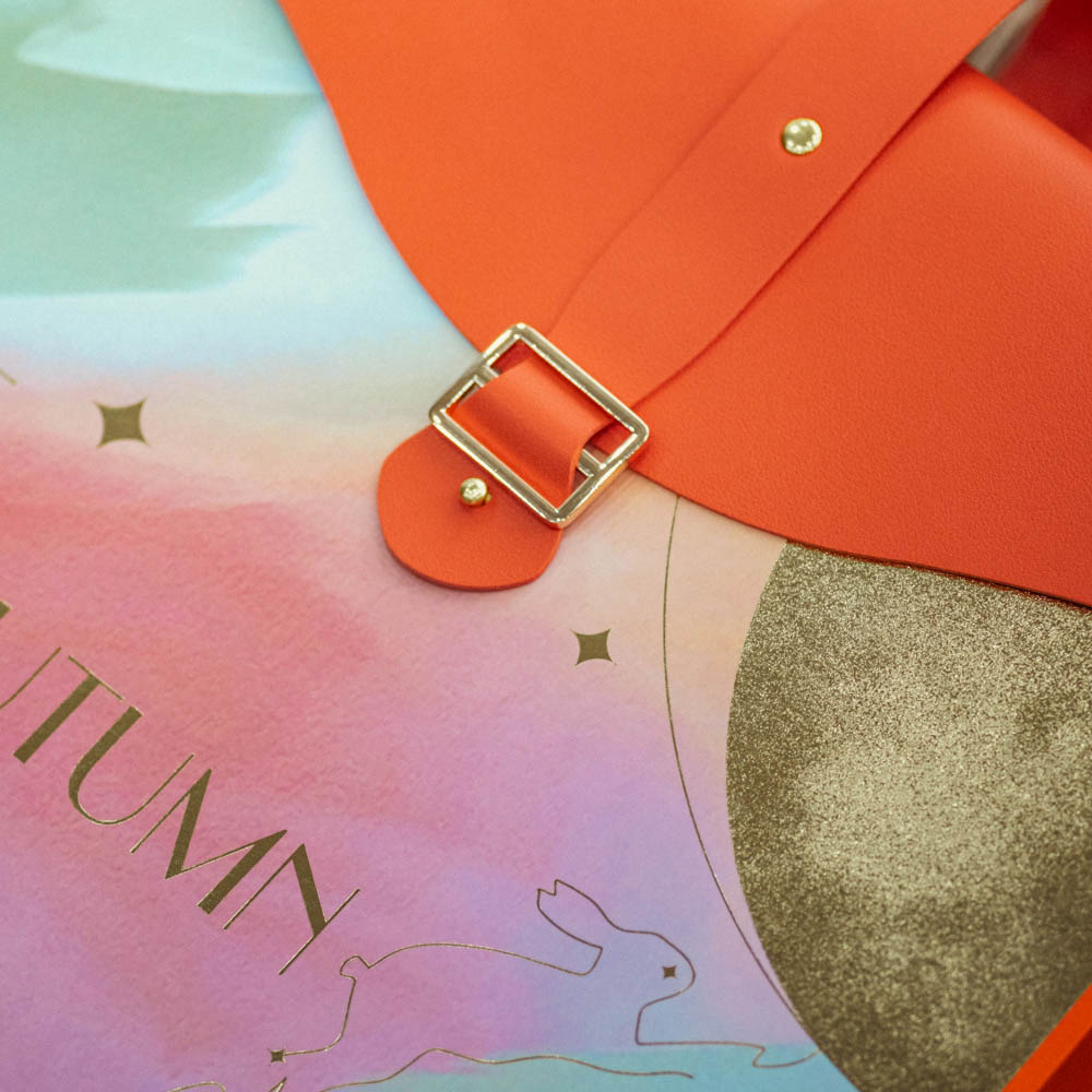A premium rigid gift box with handle and buckle, perfect for holiday gift packaging. Ideal for Mid-Autumn Festival presentation, this paperboard box features foil stamping and artistic prints.