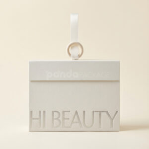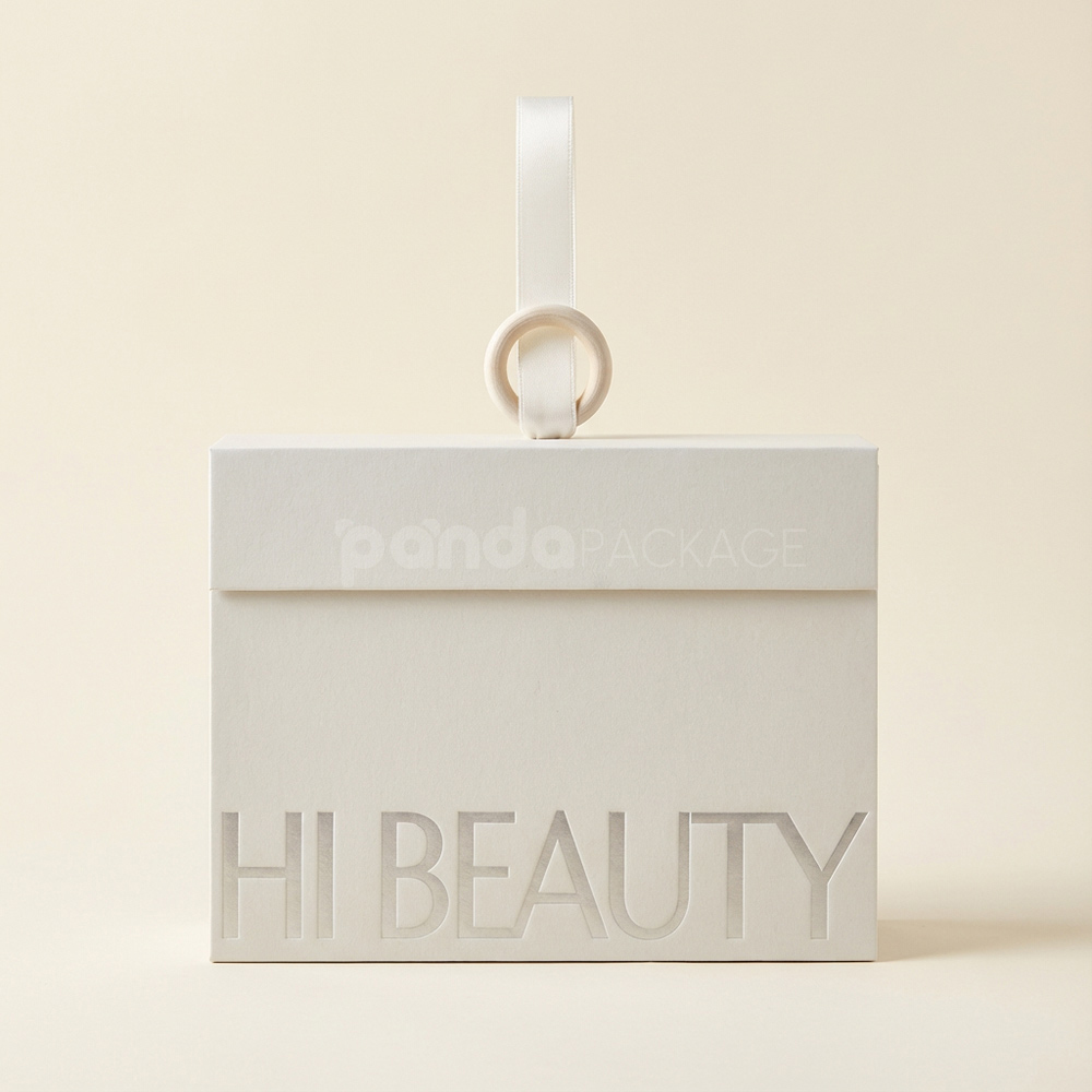 Stylish rigid box with ribbon handle and elegant debossed lettering.