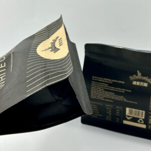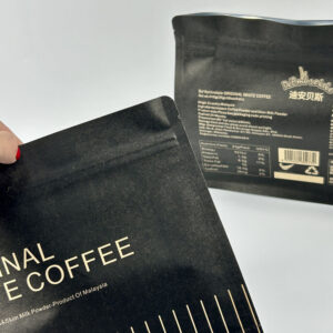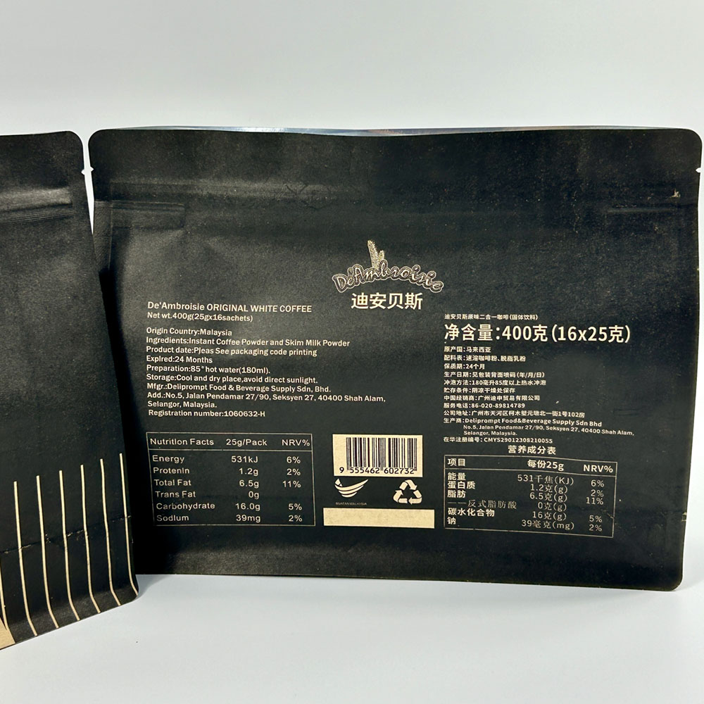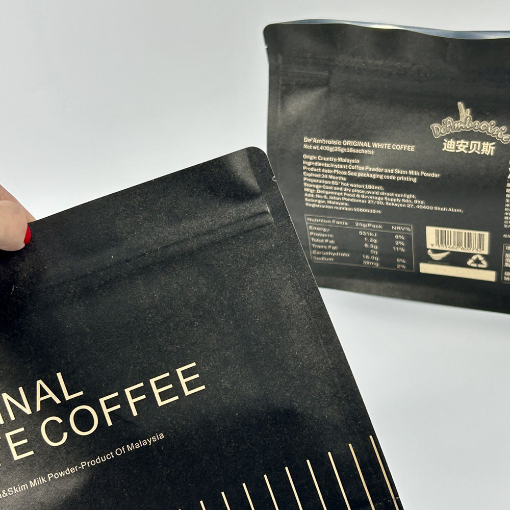 Black Coffee Pouch with Kraft Label and Vertical Stripes