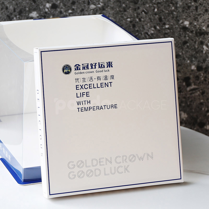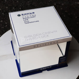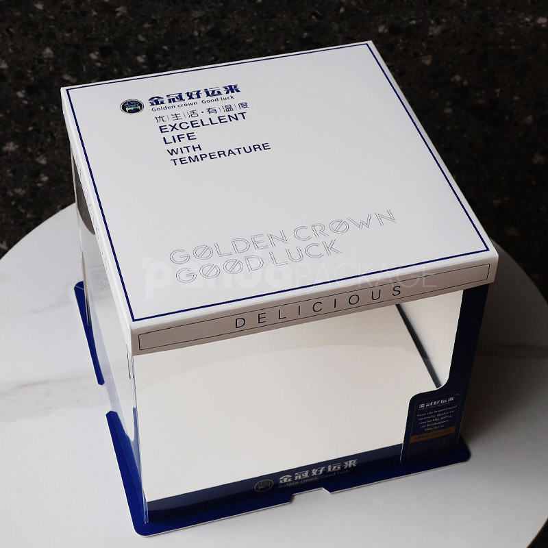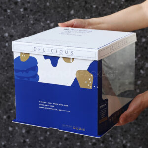 Stylish and sturdy cake box with a frosted icing motif and top handle.