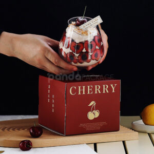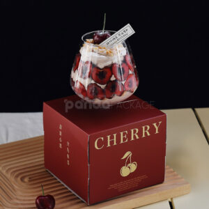 Luxurious cherry-red cake box with clear sides and a bold, festive finish.