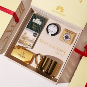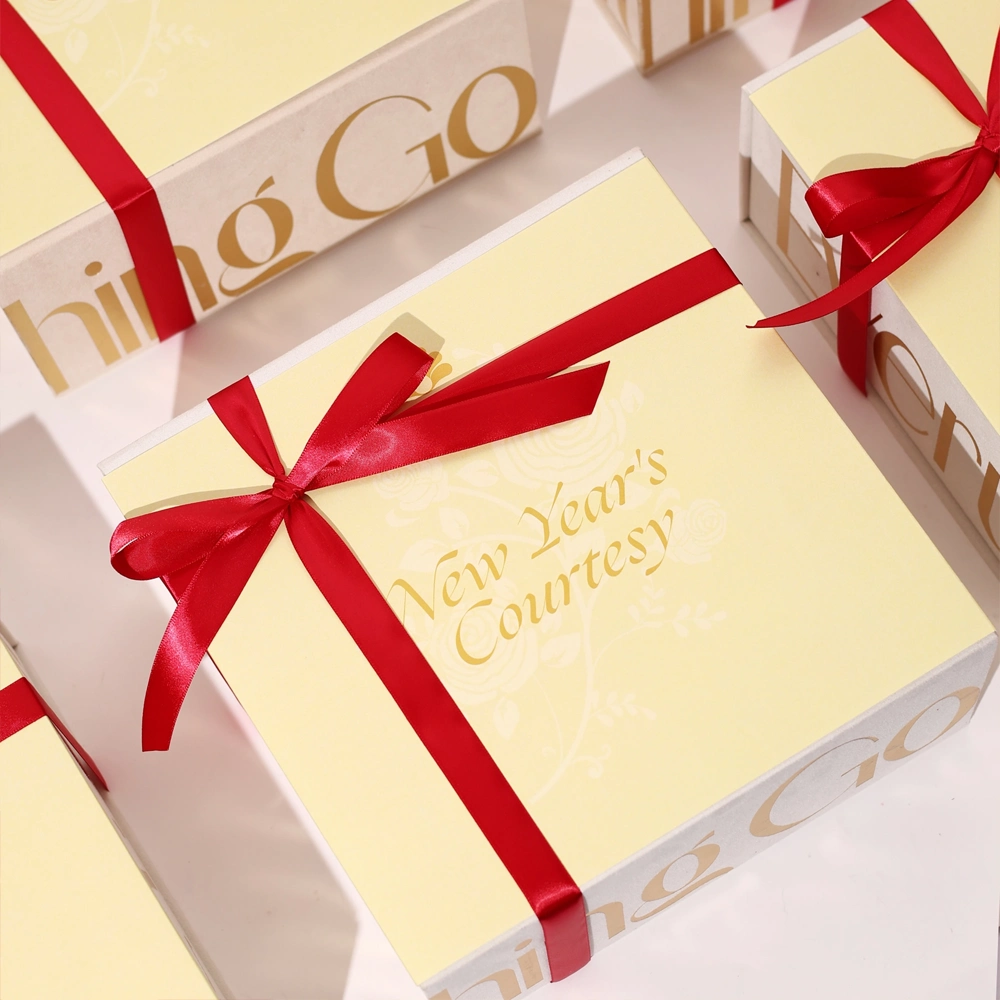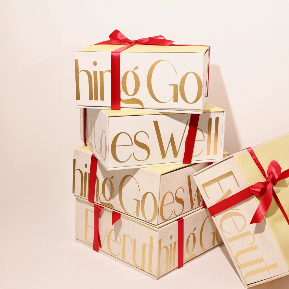 Elegant Cream & Gold Gift Box with Red Ribbon