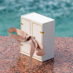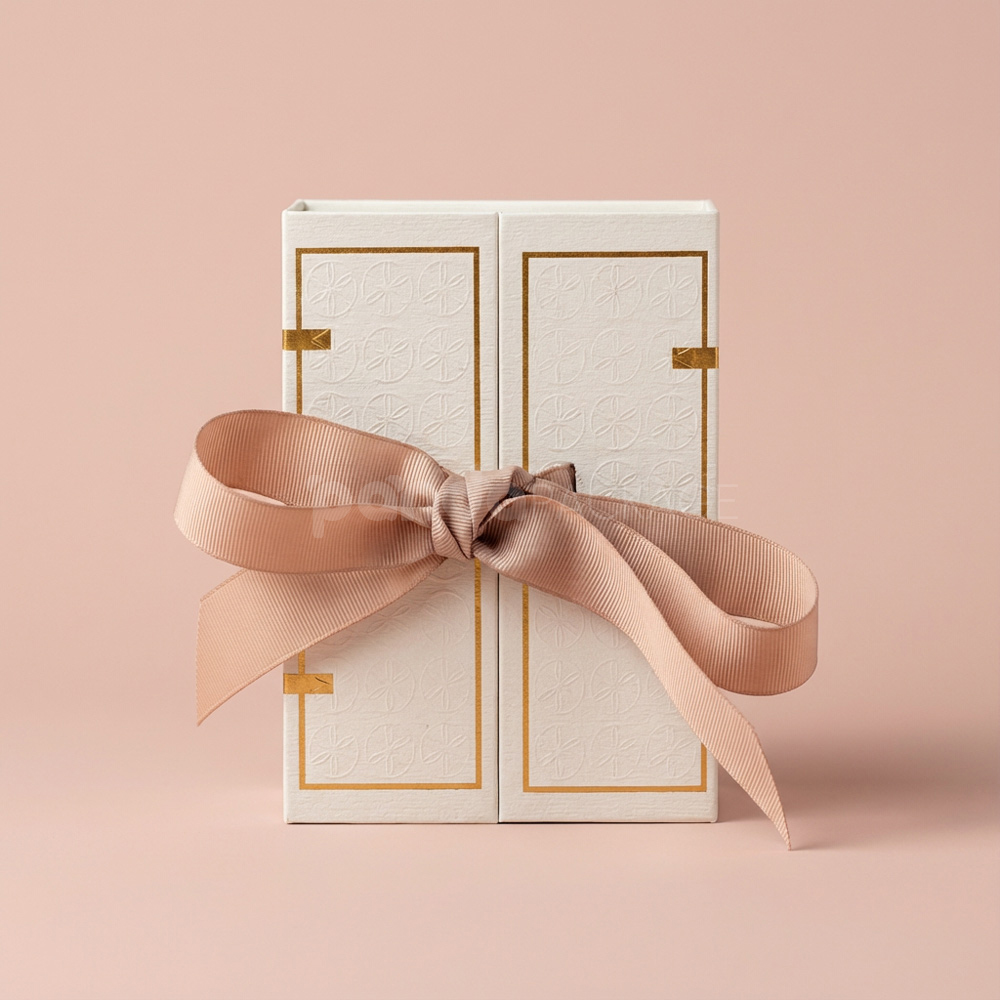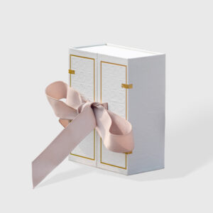 Luxurious double door rigid box featuring elegant gold foil accents, embossed details, and a wide ribbon closure. Ideal for premium gift packaging, jewelry, or presentation boxes.