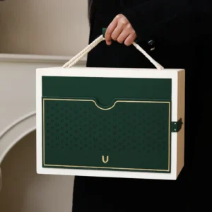Elegant Green Textured Gift Box with Handle and Ribbon Closure