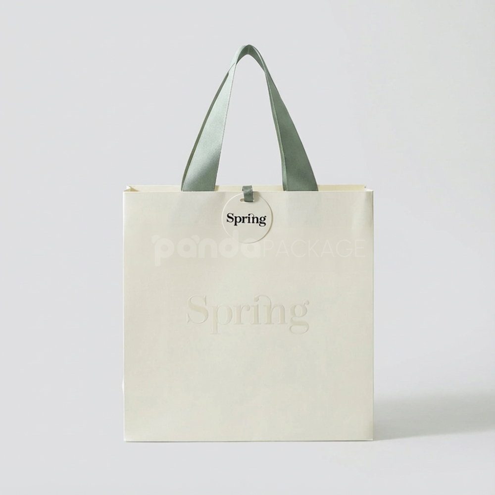 This refined gift bag from the Spring Collection brings together quiet elegance and fresh seasonal energy. Featuring a clean white matte finish and a subtly embossed “spring” logo, the design communicates simplicity and sophistication in equal measure. The wide sage green ribbon handles offer a soft contrast and add a natural, calming touch.