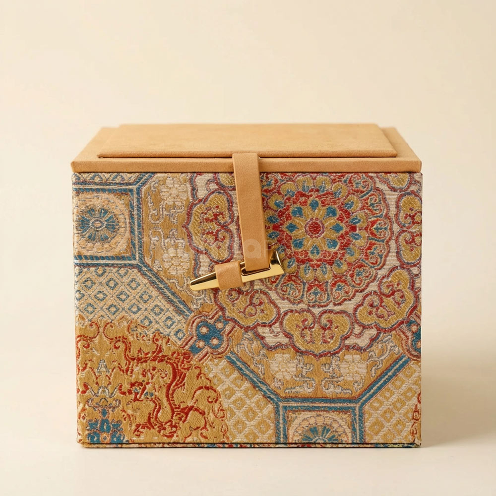 Artful and functional gift box with rich cultural prints and a soft-textured lid.