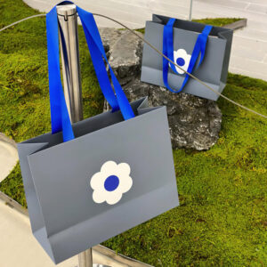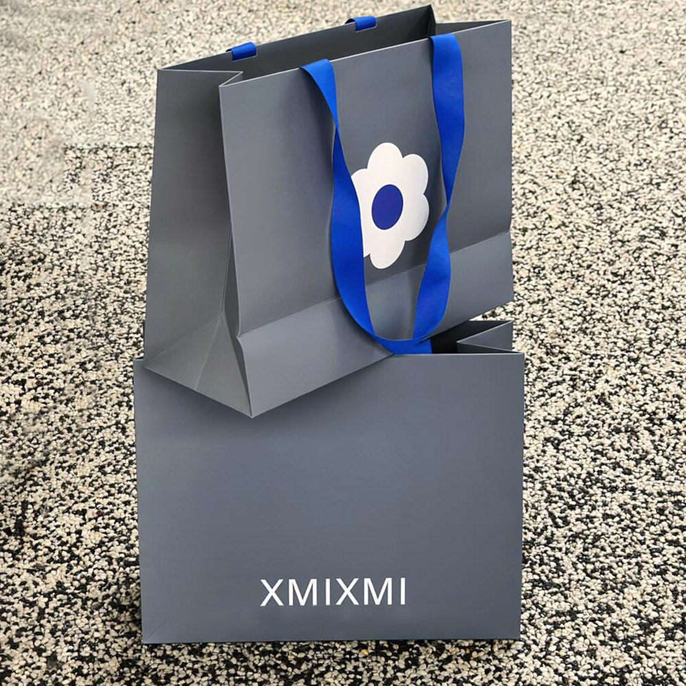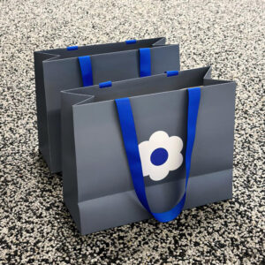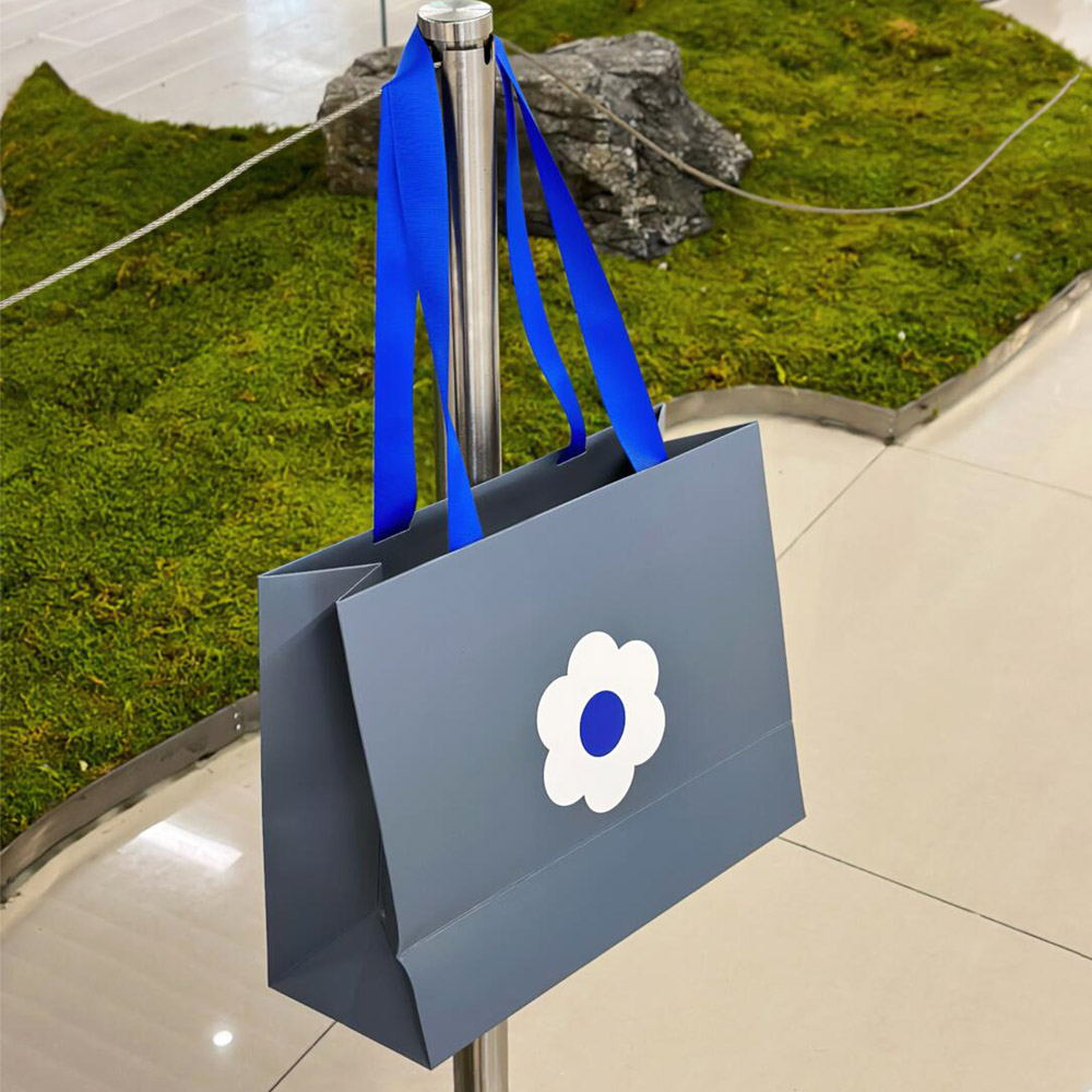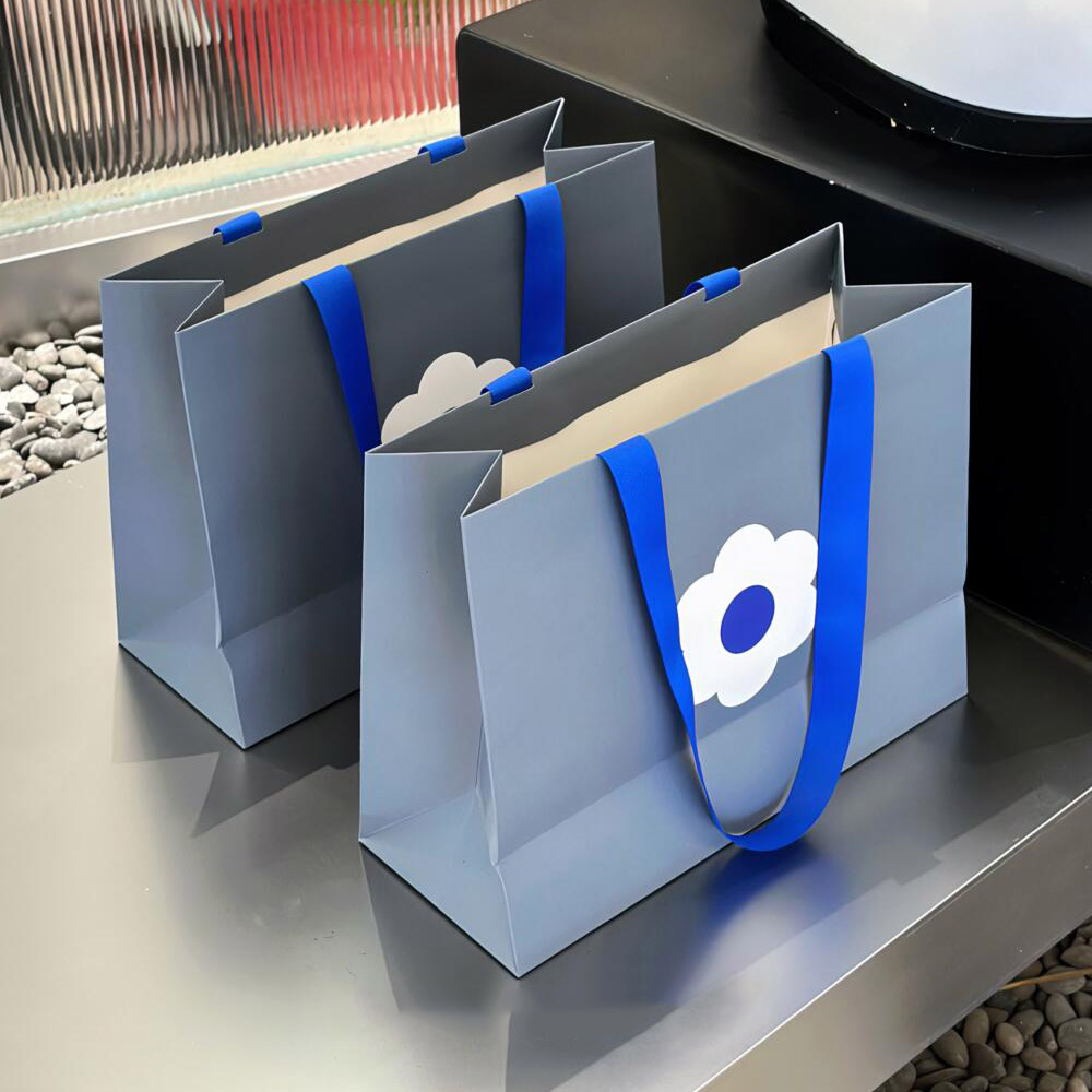 Gray Apparel Shopping Bag with Blue Handles and Flower Print