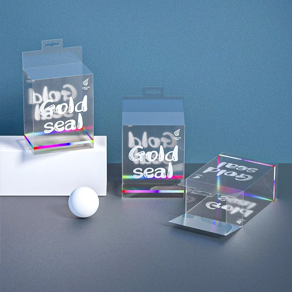 Eye-catching clear PET box with holographic rainbow finish and hanging tab, ideal for retail display and product packaging.