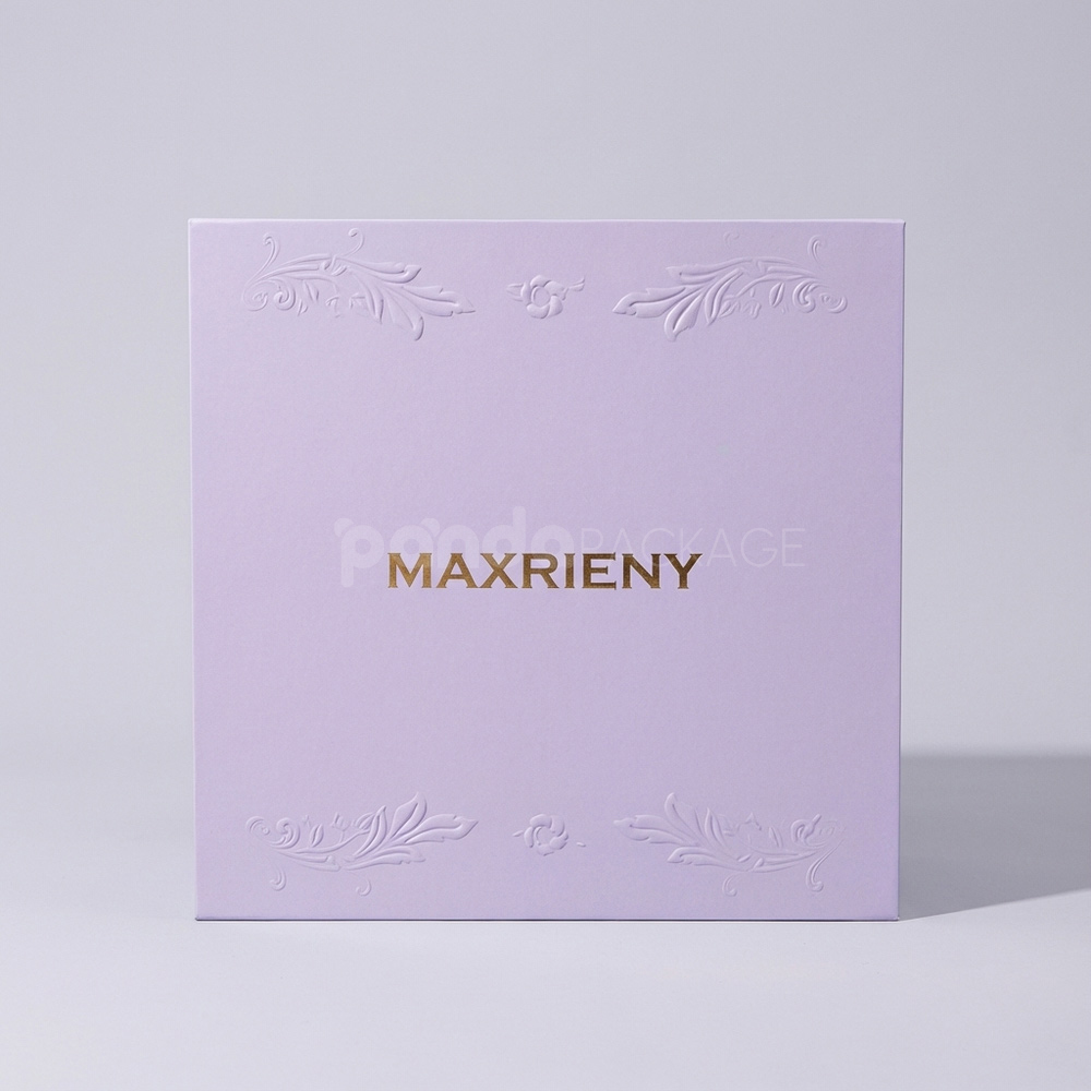 Lavender Drawer Gift Box with Gold Foil Logo and Embossed Floral Detail