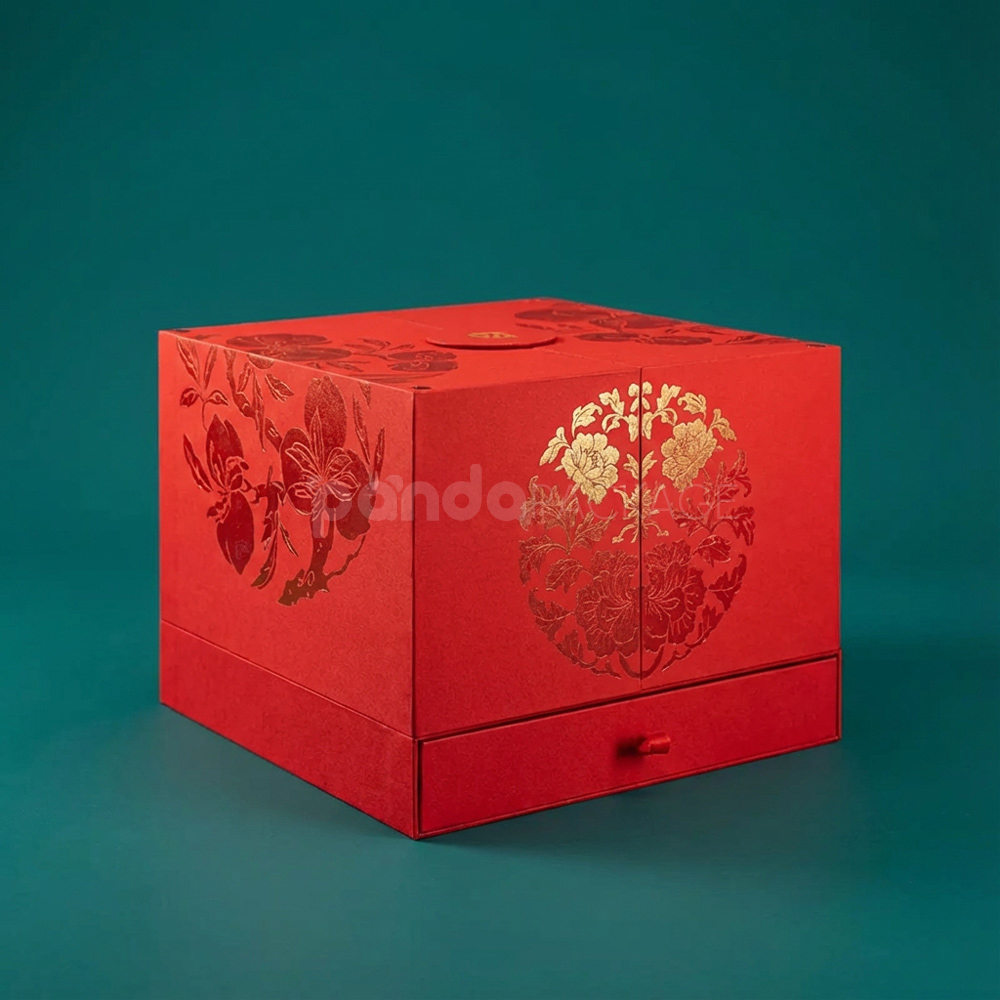 Luxurious Red Fold-Out Gift Box with Gold Accents and Cultural Motifs