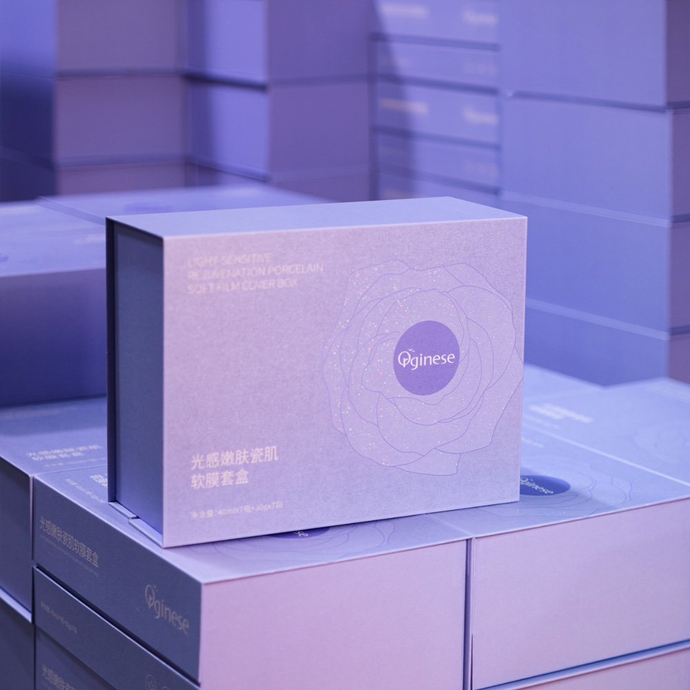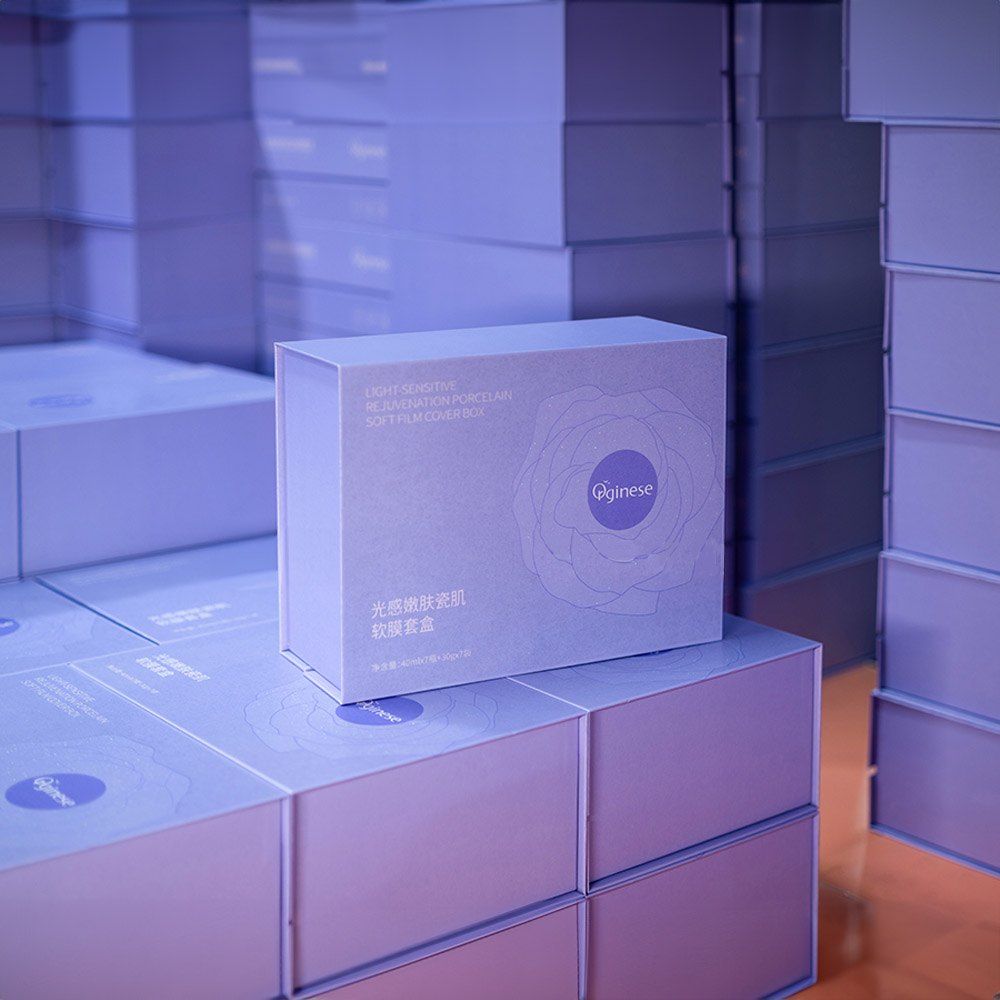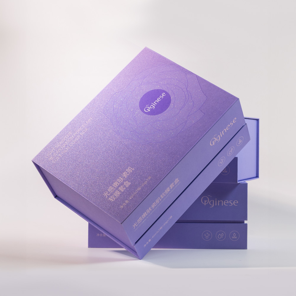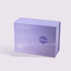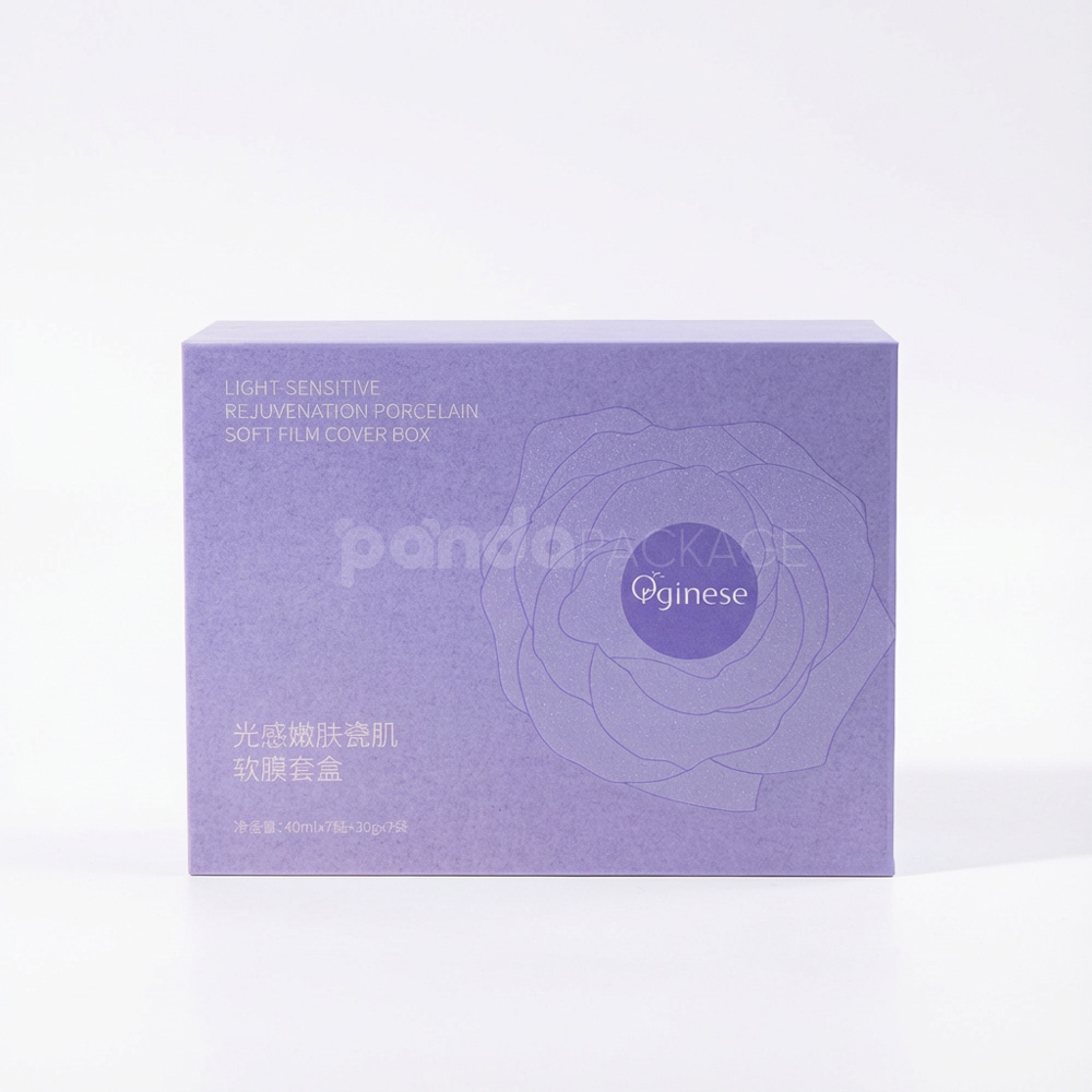 Purple rigid box with magnetic closure, ideal for skincare and cosmetic packaging. Features an embossed floral design, premium finish, and is perfect for luxury skincare gift sets.