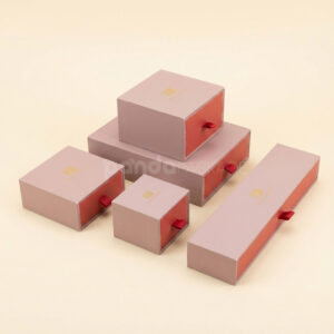 This stylish jewelry box blends muted sophistication with functionality, featuring a matte gray lid accented by a soft pink base. The drawer-style structure includes a ribbon pull tab for ease of use and a plush velvet interior that protects and showcases your jewelry beautifully. Available with different insert layouts for earrings, rings, or necklaces, this packaging is ideal for both retail displays and premium gift presentations.