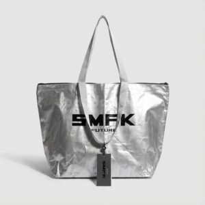 Metallic Silver Laminated Fashion Shopping Bag with Bold Logo Print