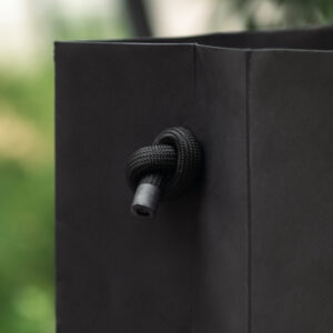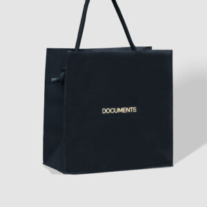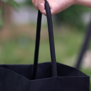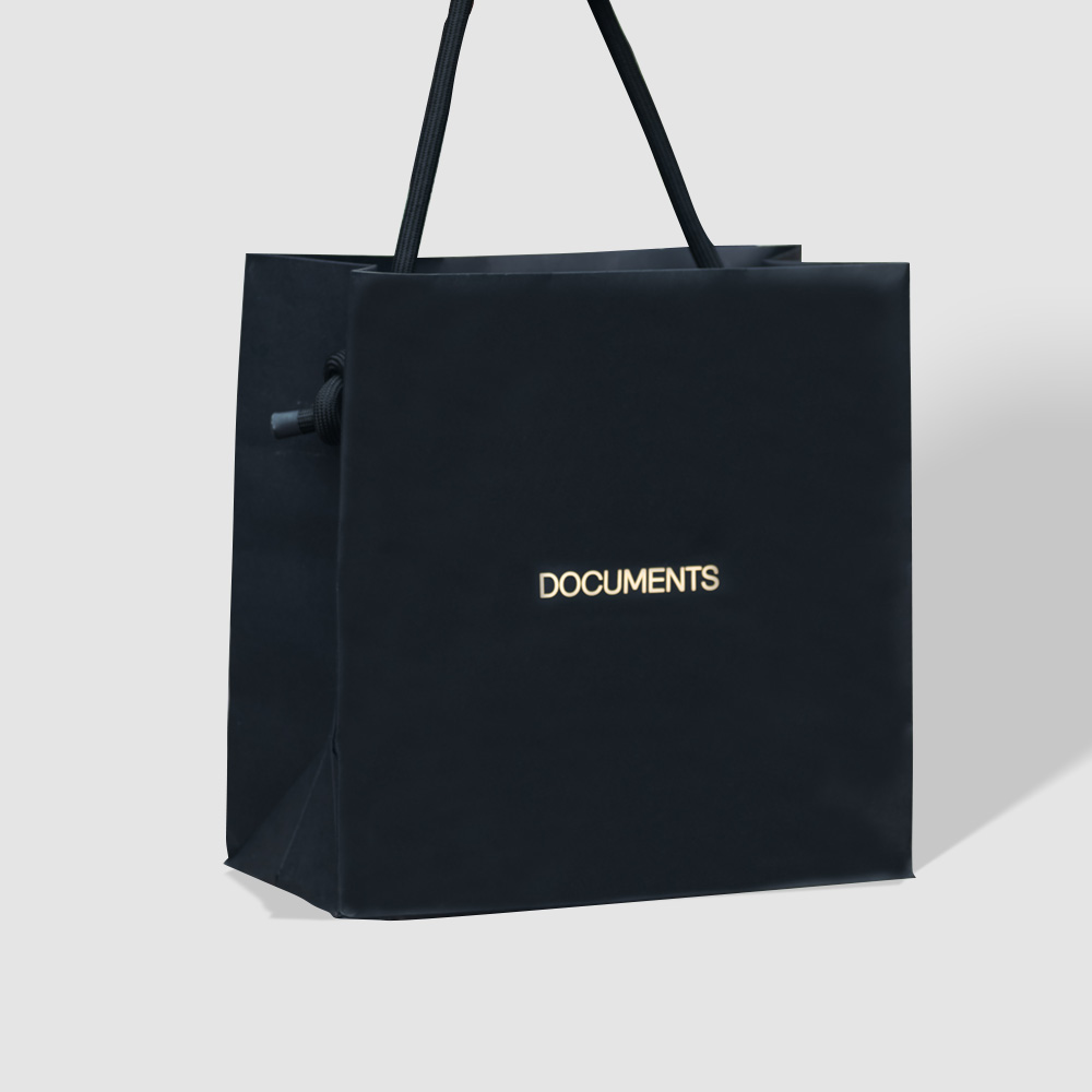 Luxury matte black paper bag with thick rope handles and gold foil logo, ideal for retail, jewelry, or gift packaging. Sturdy structure and high-end design enhance brand value.