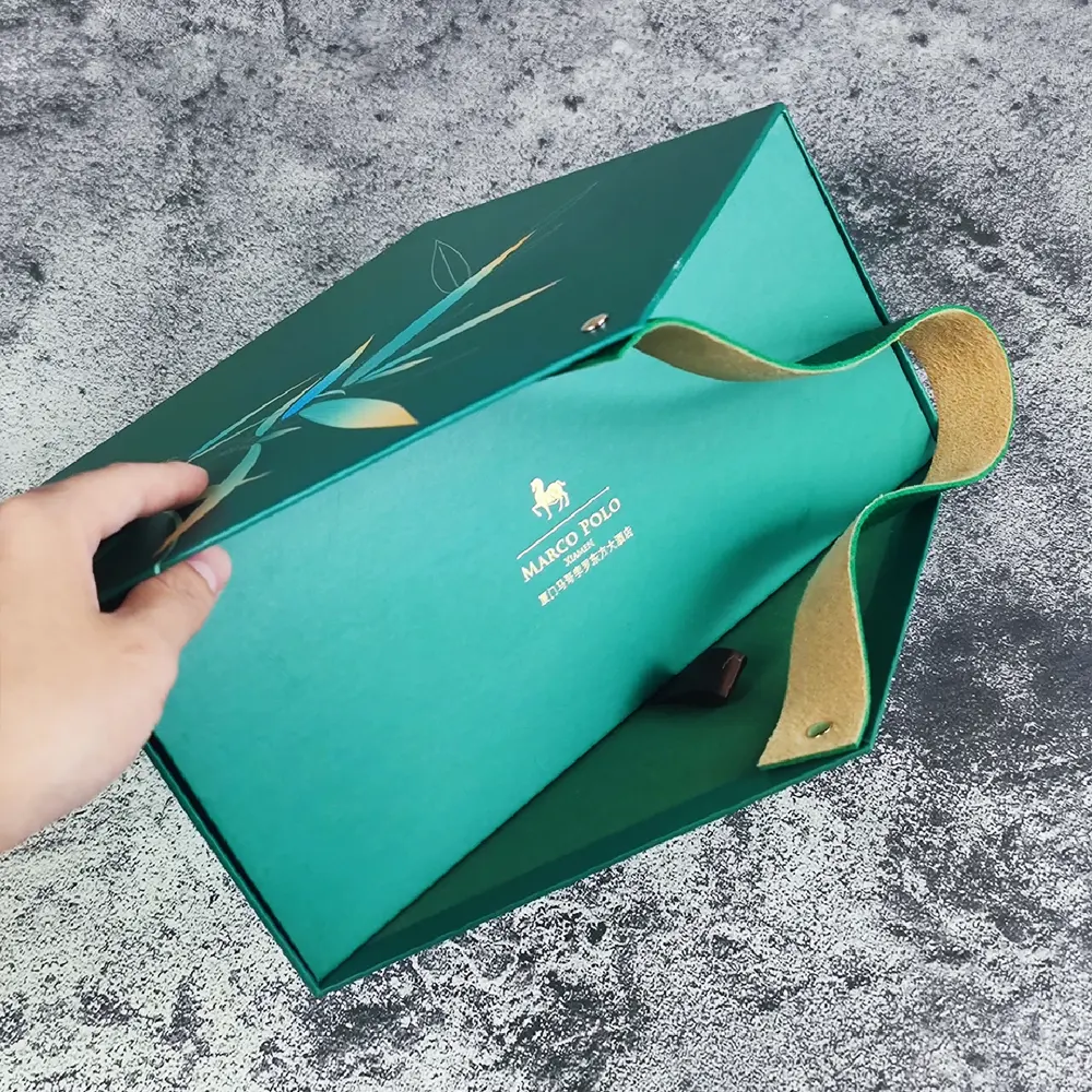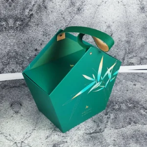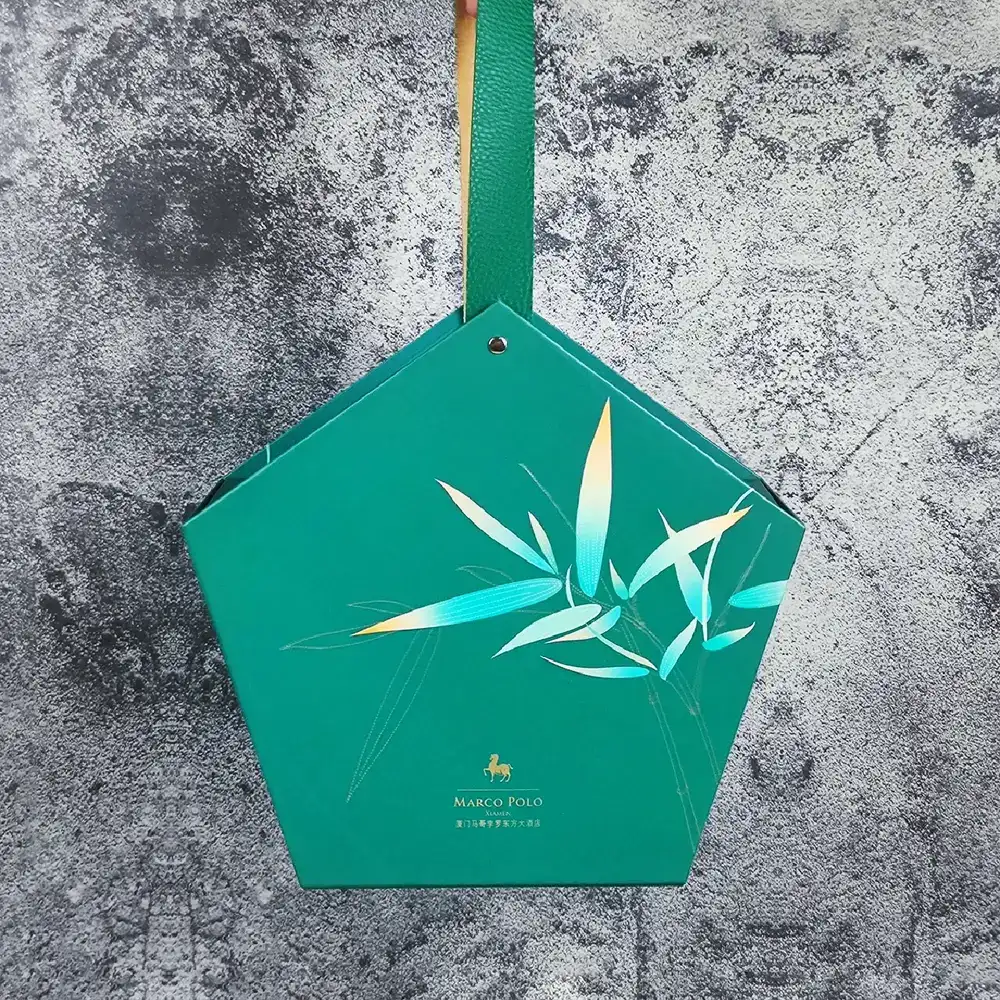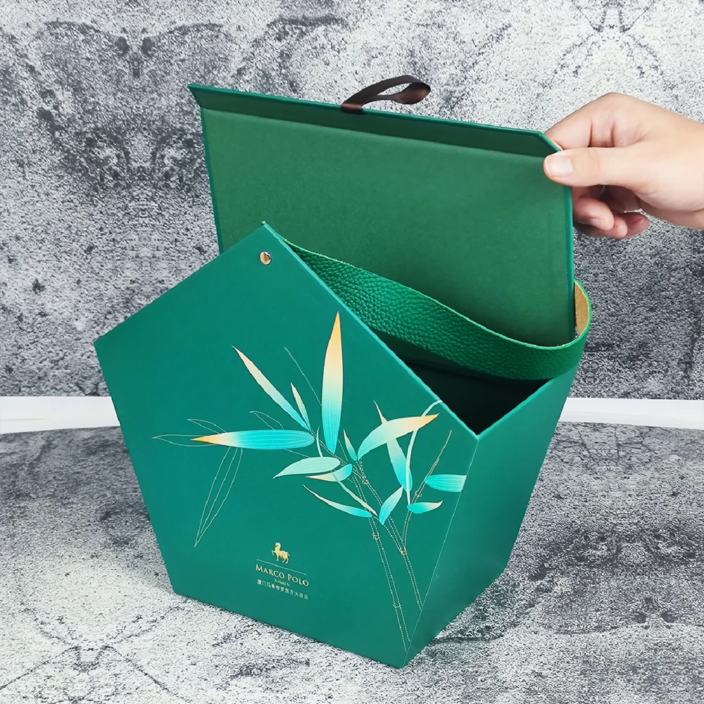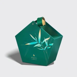 Pentagon-shaped rigid gift box featuring elegant bamboo artwork and a sturdy carry handle. Ideal for premium gift packaging, specialty products, and retail display.