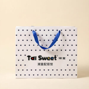 This eye-catching paper bag is designed for “Tat Sweet” and features a playful black polka dot pattern on a crisp white background, striking a perfect balance between fun and elegance. The premium rope handles in bold blue not only provide a strong grip but also add a splash of color that enhances the overall visual appeal.