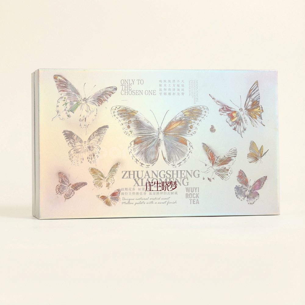 Refined and artistic packaging with metallic sheen and graceful butterfly accents.