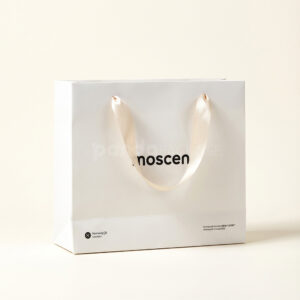 Constructed from thick, rigid paperboard, the bag maintains its shape even when housing heavier beauty items, fashion accessories, or curated gift sets. Discreet corner graphics and a subtle bottom trim introduce just enough visual interest without detracting from the bag’s clean aesthetic.